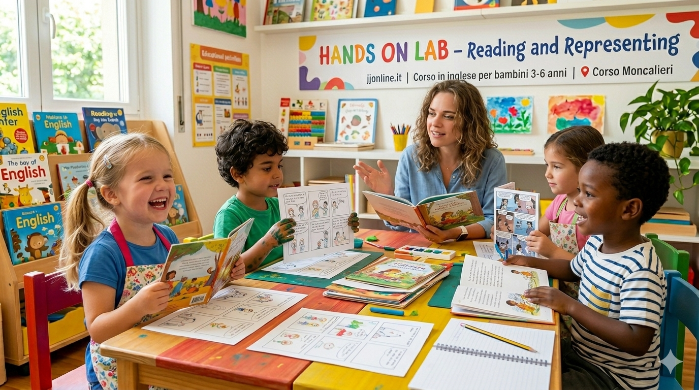 Un corso creativo “Hands On” dove i bambini ascoltano storie in inglese e le trasformano in attività pratiche: arte, manipolazione,