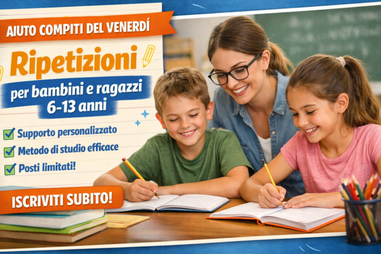 Aiuto compiti e ripetizioni per bambini e ragazzi dai 6 ai 13 anni ogni venerdì pomeriggio. Supporto allo studio personalizzato in un ambiente sereno e motivante.